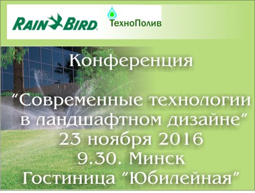 Организатор конференции: ООО «ТехноПолив» совместно с компанией Rain Bird (USA)Время проведения с 9.30 до 16.00, 23 ноября 2016 (среда).