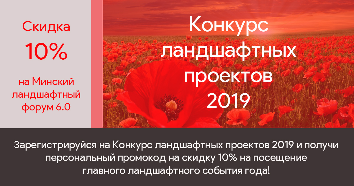 Для участников Конкурса предоставляется скидка в размере 10% на главное ландшафтное событие года — Минский ландшафтный форум 6.0! Чтобы получить скидку, необходимо зарегистрироваться на конкурс, получить шифр работы, получить индивидуальный промокод и указать его при покупке билета на Форум в поле «промокод» на портале Безкассира или в поле «назначение платежа» при оплате через клиент-банк.