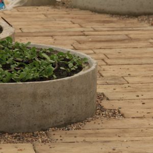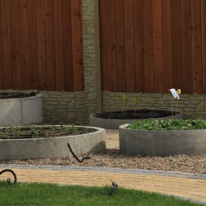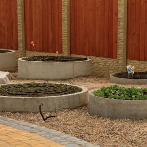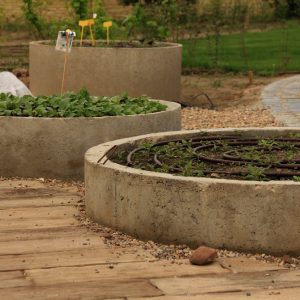В этом огороде, в качестве модуля были взяты бетонные кольца диаметром 600 и 900мм. Высота приподнятых модулей разная от 250 до 800мм. В каждый модуль проведен капельный полив. Кольца заполнены питательным почвогрунтом на 500мм. Затем прослойка гравия 200мм. Между почвогрунтом и гравием лежит геотекстиль. Он не позволяет слоям смешиваться, а так же препятствует проникновению кротов в питательный почвогрунт. Пространство между приподнятыми модулями заполнено гравием и плиткой.