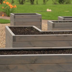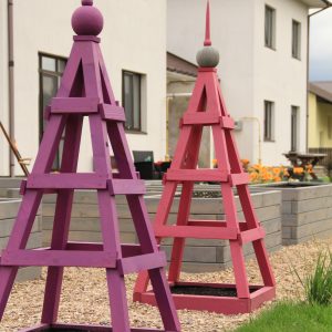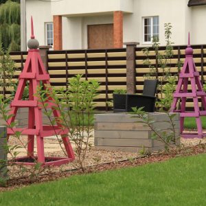 Следующий модульный огород состоит из Г-образных и квадратных деревянных модулей. Общая площадь огорода 60 м2. Высота приподнятых модулей 500 мм. Внутри каждый модуль выстлан плотной пленкой, чтоб мокрая земля не контактировала с деревом. Еще в огороде есть арт-объекты – садовые обелиски. Это тоже модуль. Они служат местом для посадки и опоры вьющихся растений. Привносят в огород яркие акценты.
