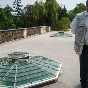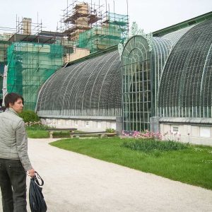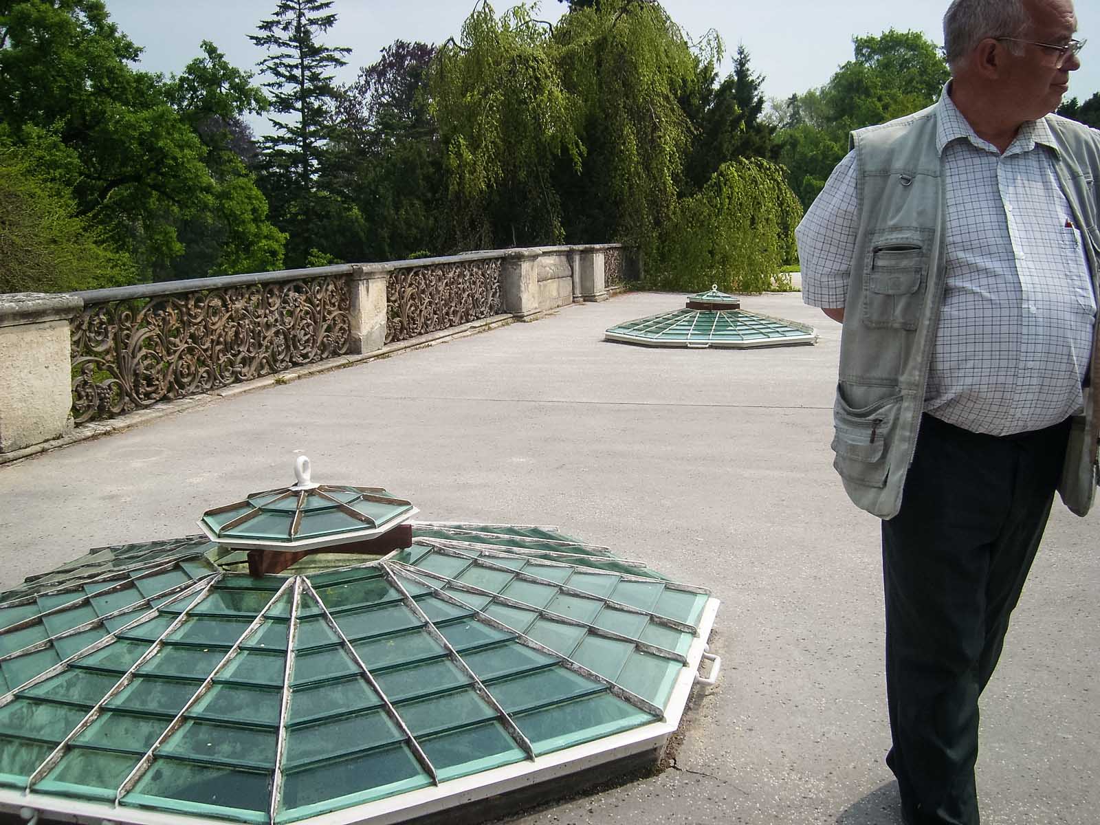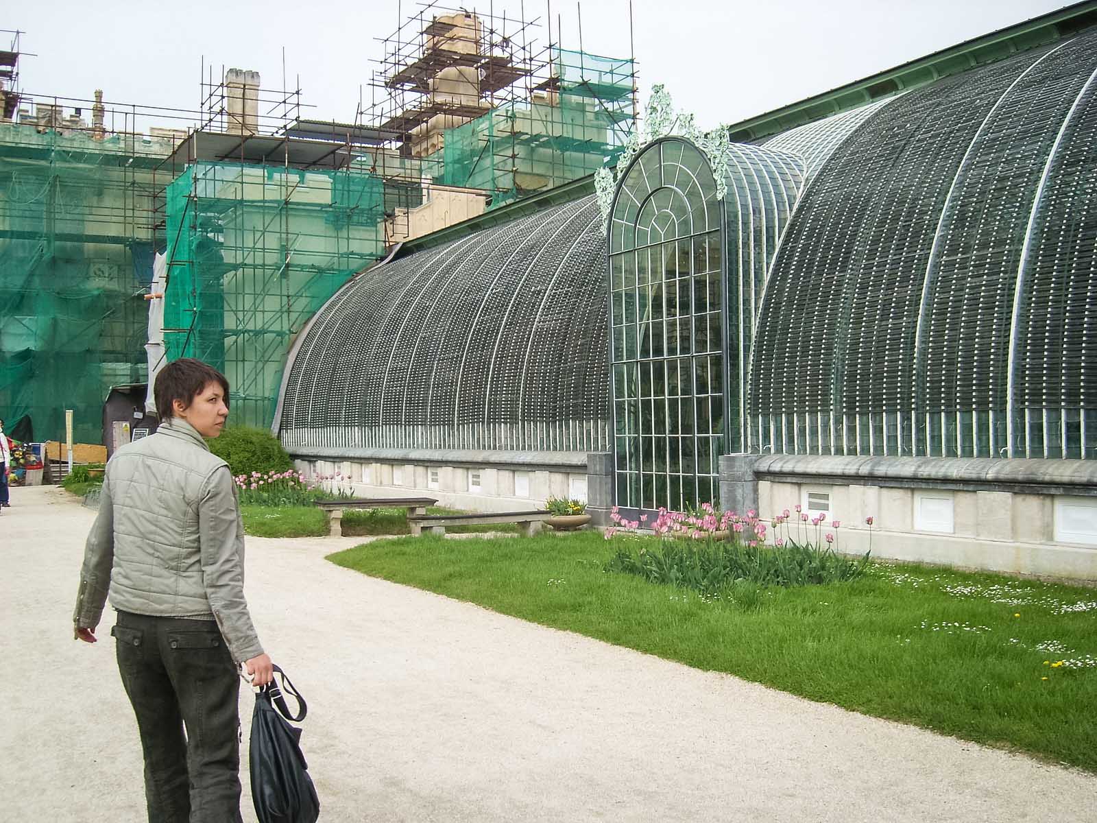 Сама оранжерея хитро устроена на перепаде высот, половина её высоты спрятана в холме, таким образом, появляется возможность прогуливаться по крыше с вентиляционными отверстиями. С этой площадки открывается отличный вид на ландшафтную часть парка с причудливо извивающимися дорожками, живописными группами деревьев, каналами и прудами, по которым можно проплыть на лодке, любуясь видами.