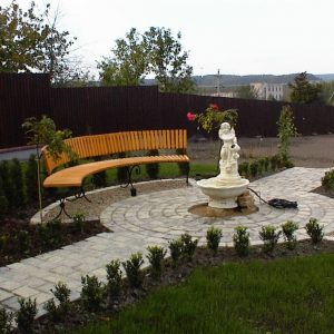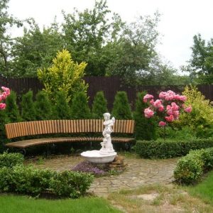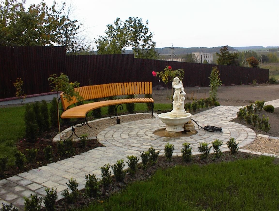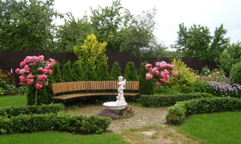 Дорожка от дома к бане проходит через небольшую круглую площадку с капельным фонтанчиком. Было решено оформить её в романтичном полуформальном стиле, сюда отлично вписались штамбовые розы и фигурные изгороди из самшита.В центре площадки, под фонтаном, растет тимьян.