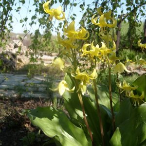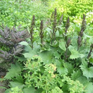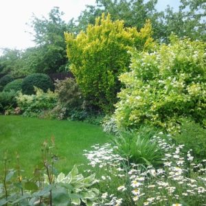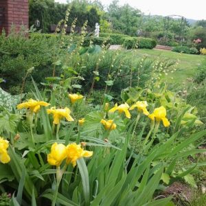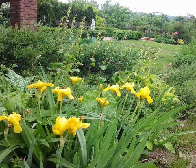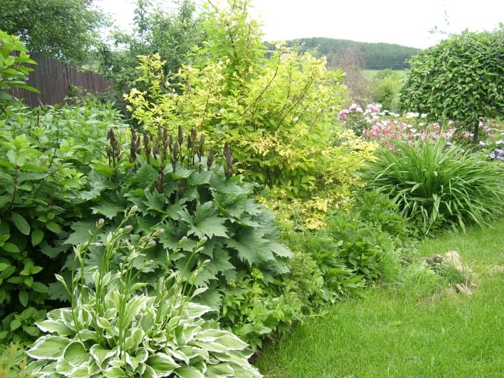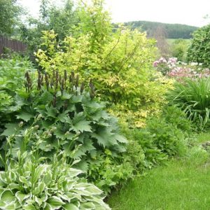 Ярких красок весной и в начале лета добавляют карликовые ирисы, телима, желтолистная хоста и гравилат. Цветовая гамма в это время решена в солнечных тонах, чтобы желтый цвет перекликался с молодой золотой листвой граба и салатово-лимонным кустом чубушника «Аурея»в дальнем миксбордере, кустиками спиреи японской «Голдмаунд», оранжевым пышноцветущим кустом листопадного рододедрона. Особое удовольствие – наблюдать за сочетанием цвета и формы даже в нецветущих посадках, например, как в композиции цветочных стрелок бузульника «Отелло» и отрастающих листьев цимицифуги «Атропурпурея», или за игрой оттенков цвета, структуры и формы в трио из кипарисовикагорохопродного, самшита и хосты.