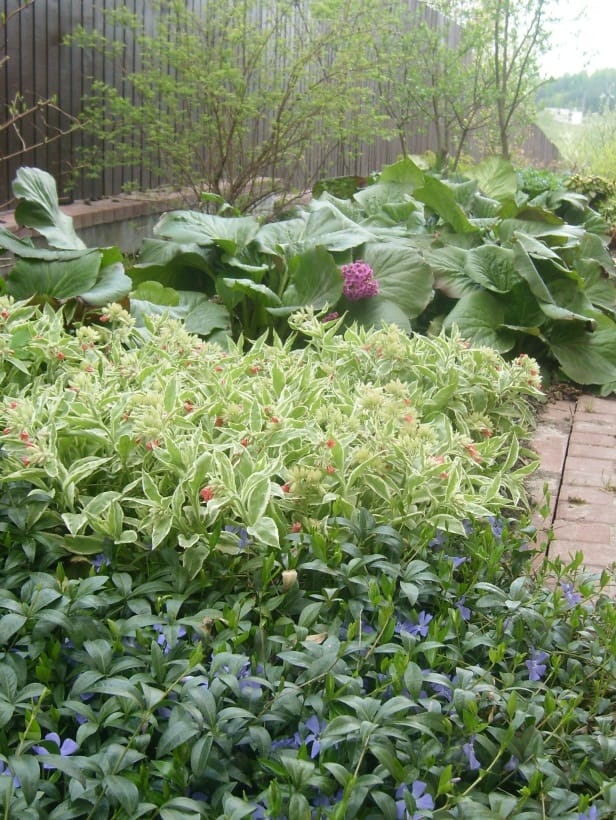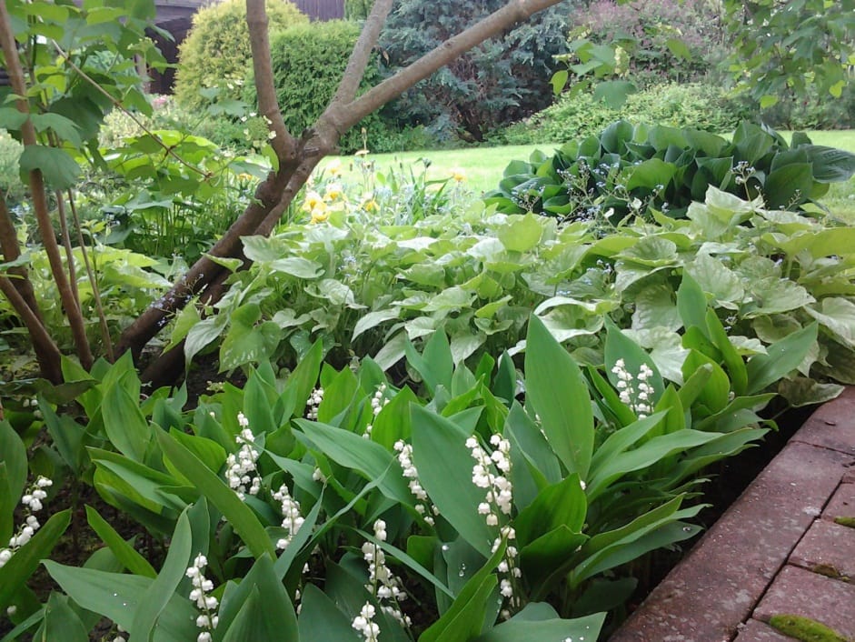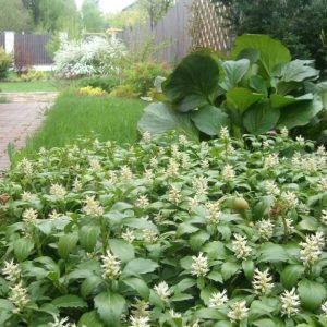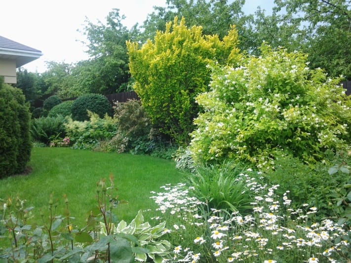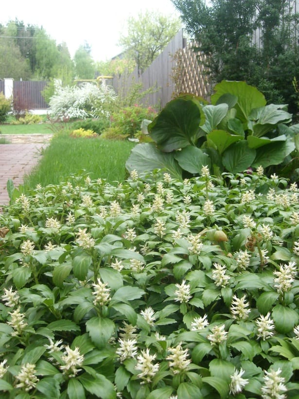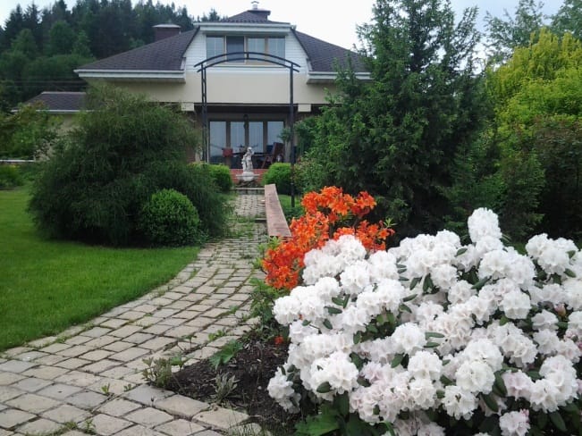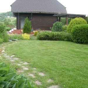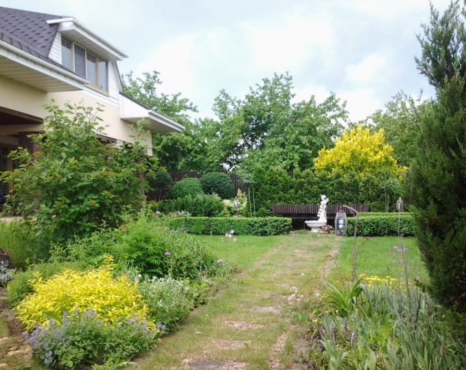 Проход вдоль дома с этой стороны оформлен тенистым цветником, который продолжает этот миксбордер. Здесь прекрасно себя чувствуют бересклеты, гортензии, снежноягодник, ирга, кустарниковый зверобой, тисс, а также многолетники — папоротники, волжанка, барвинок, медуницы, пахизандра, бадан, высаженные большими куртинами.