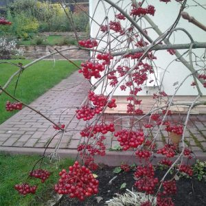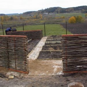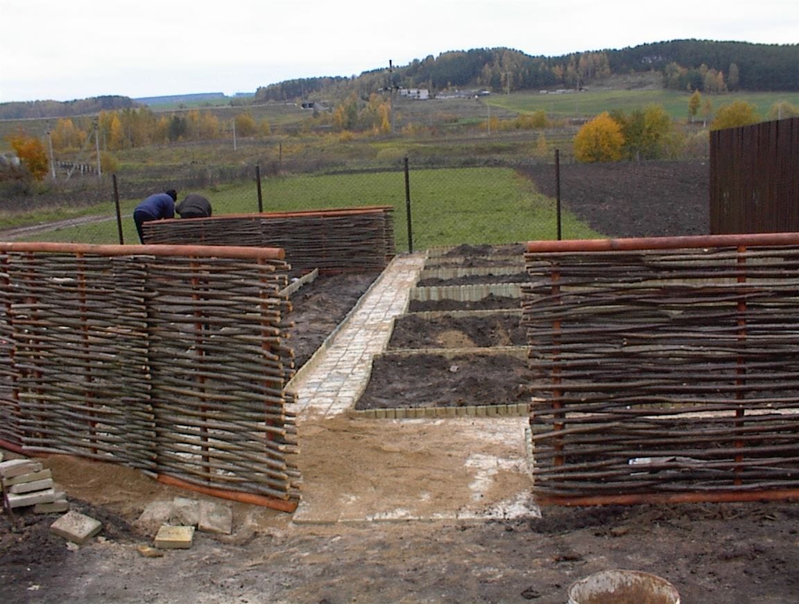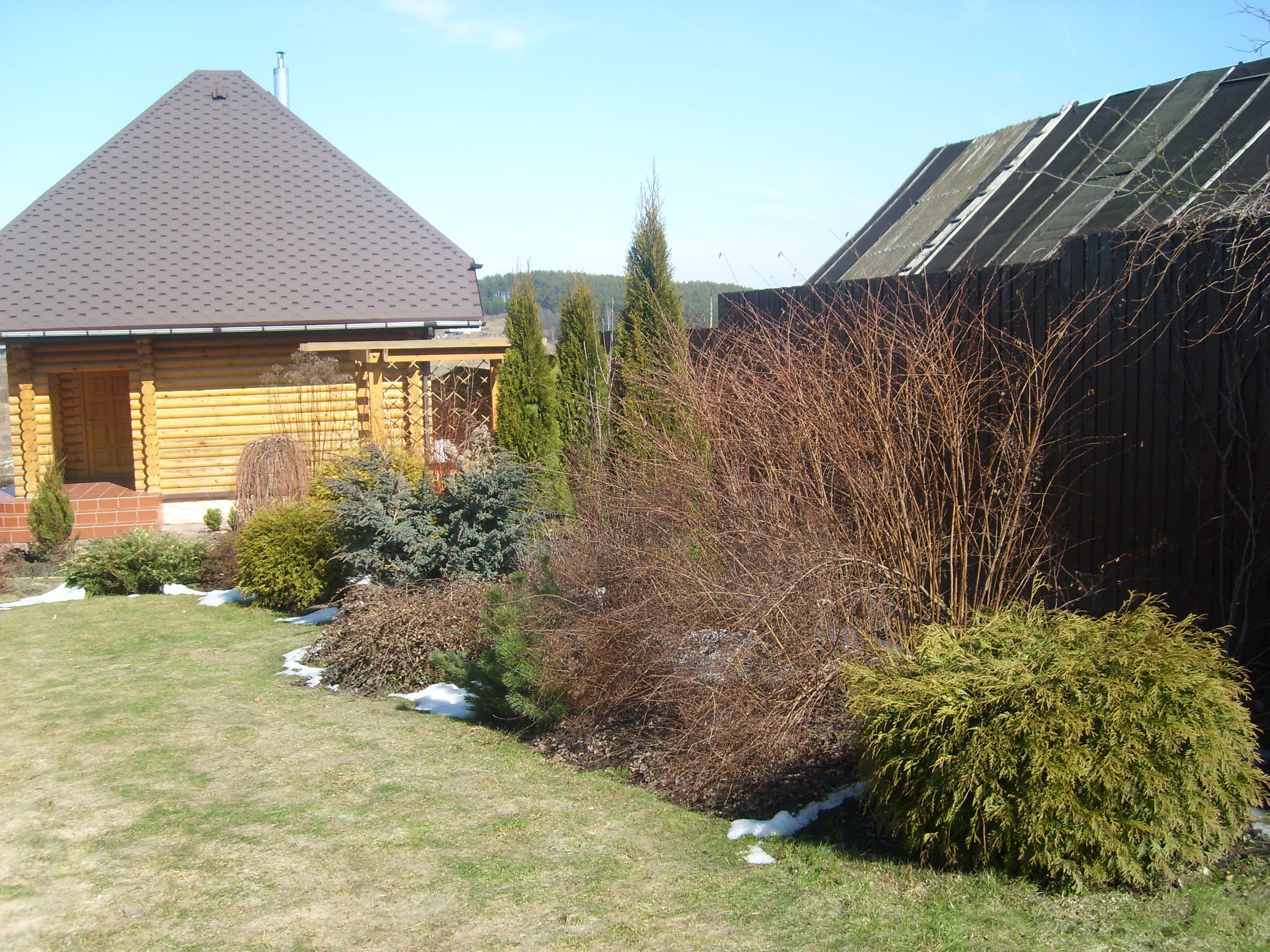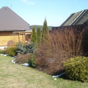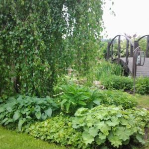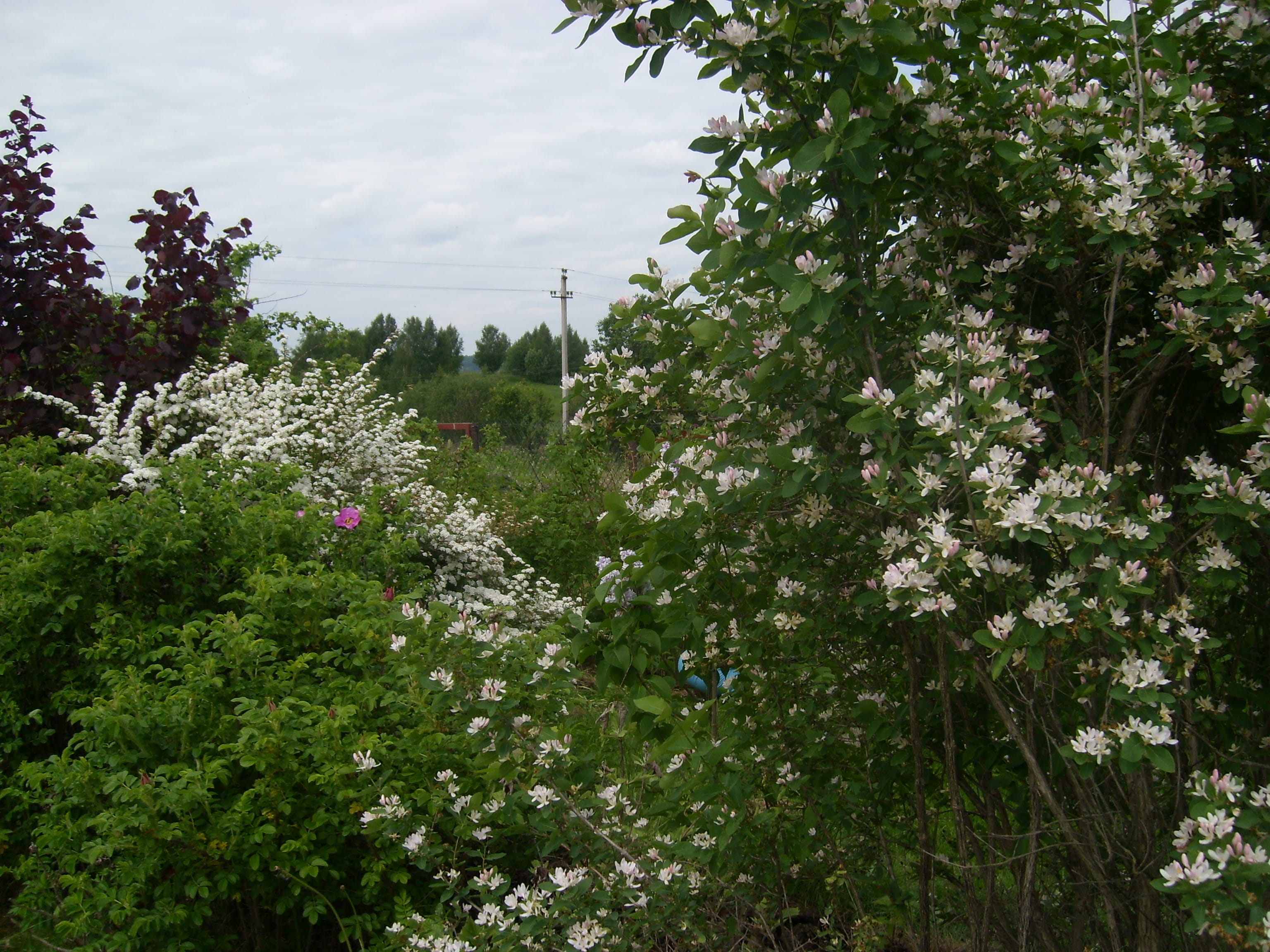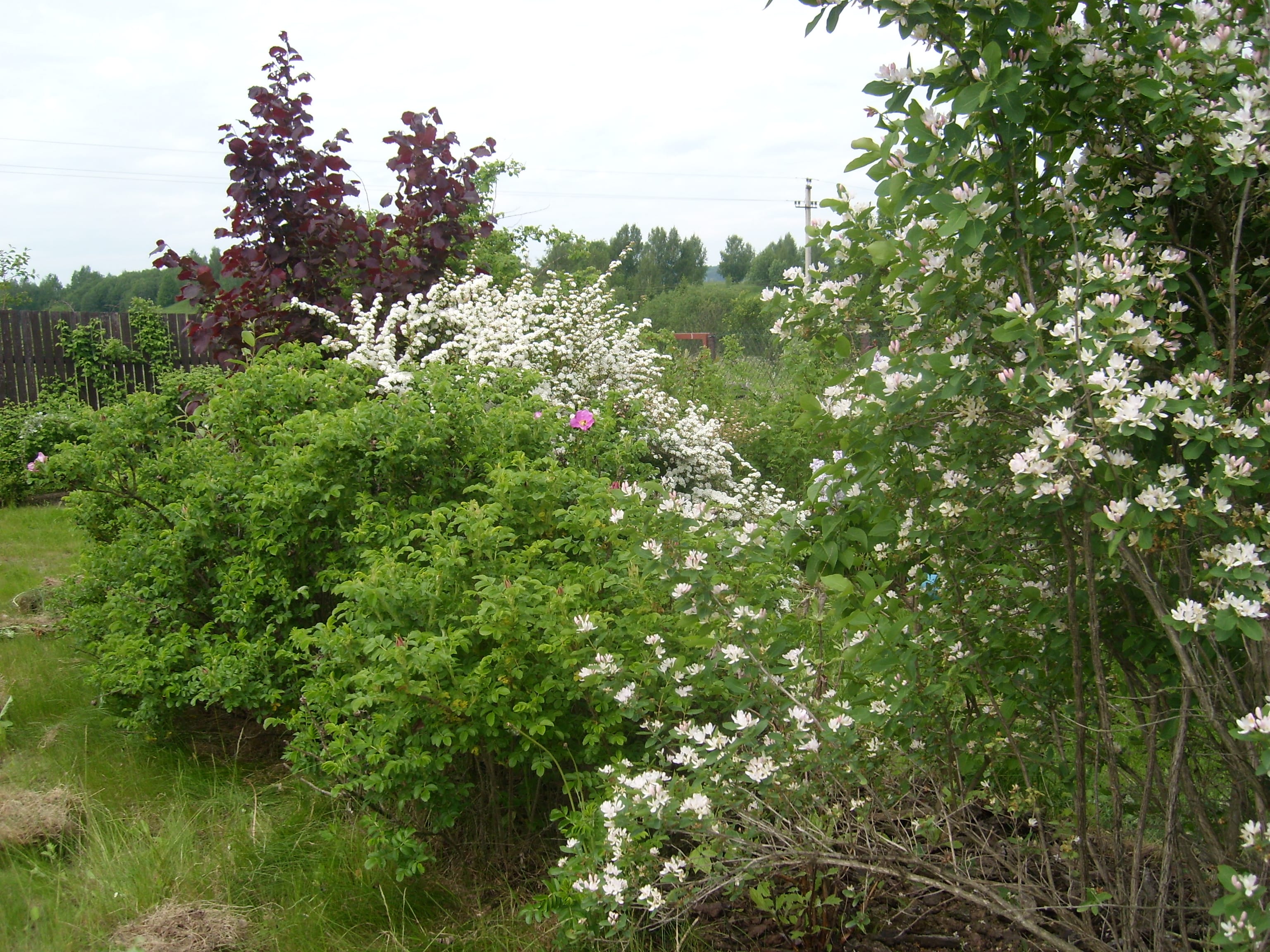 Рядом с огородом — хозяйственный въезд, спрятавшийся за живыми многорядными изгородями. Именно здесь были высажены «непородистые», но такие милые кустарники – роза сизая, роза морщинистая, жимолость татарская, боярышник, смородина золотистая, черноплодная рябина. Хорошо вписались сюда и некоторые сортовые кустарники — орешник пурпуролистный, дерен,вейгелаи сирени. В конце участка – заросли малины и ежевики, плодовые кустарники.