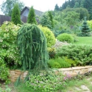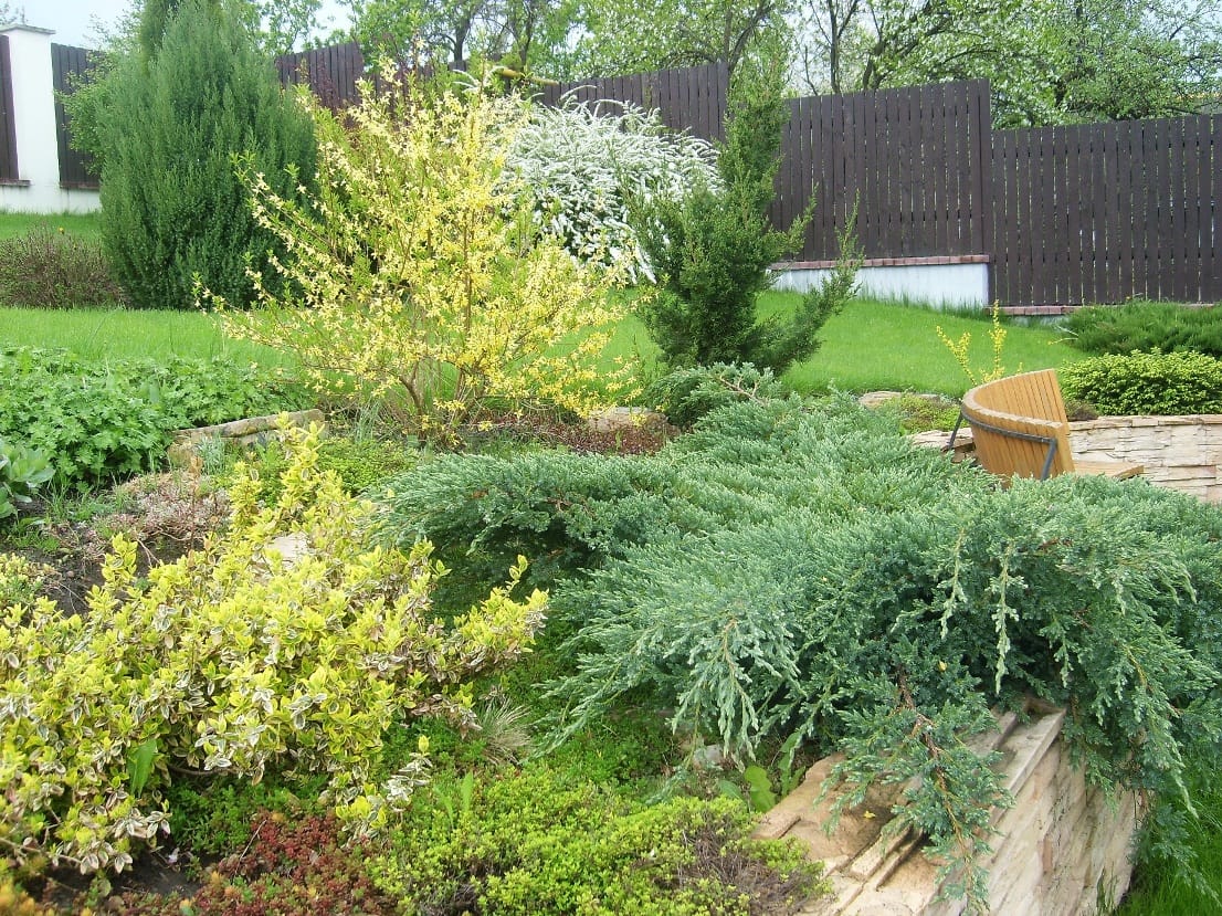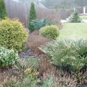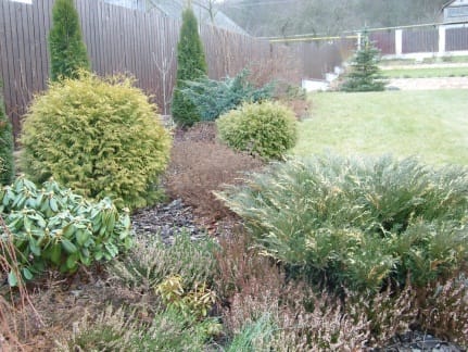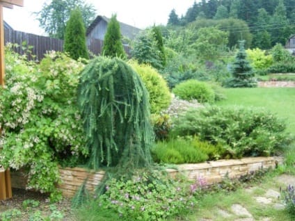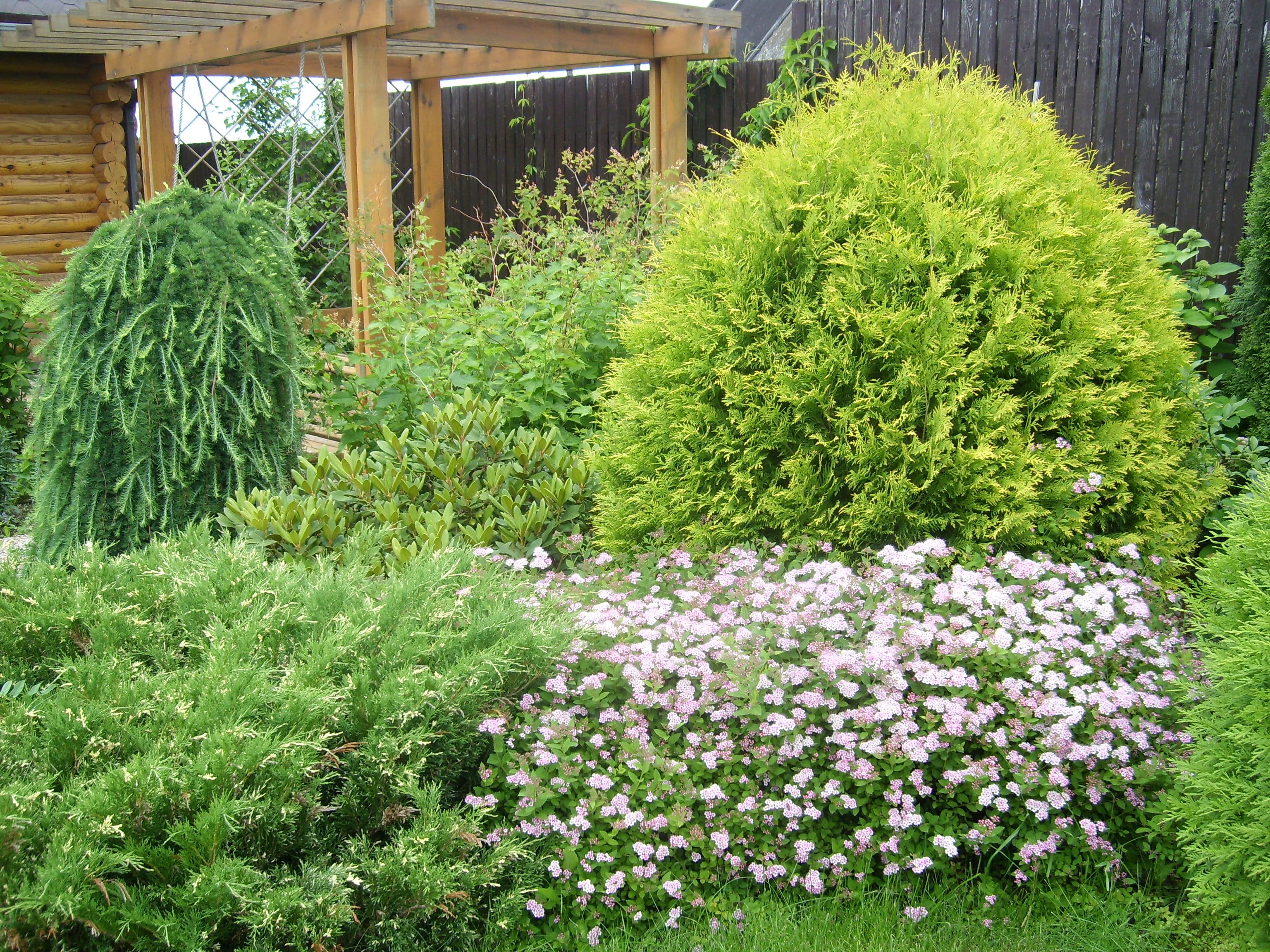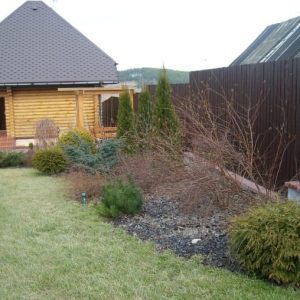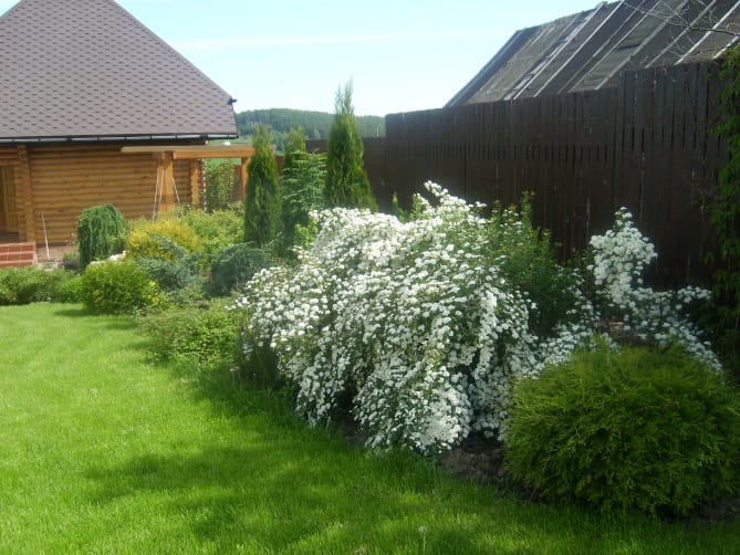 Посадку с другой стороны тропинки, у забора, миксбордером назвать, наверное, нельзя – в нее не входят многолетники, но комбинация из красивоцветущих кустарников и хвойных растений делает эту композицию декоративной круглый год.
