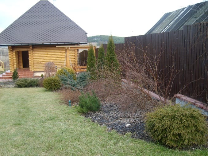 Когда мы пришли на участок, там стояли только дом и баня.Заказчица хотела сад, в котором было бы много растений, водоем, газон, огород, укромные уголки и общие зеленые гостиные. Перед домом находится довольно большой склон, значит, к этому перечню добавился еще и альпинарий.А еще плодовый сад. И хорошо бы розарий. И фонтан. И конечно новогоднюю елку. И на все про все отводилось около 20 соток.