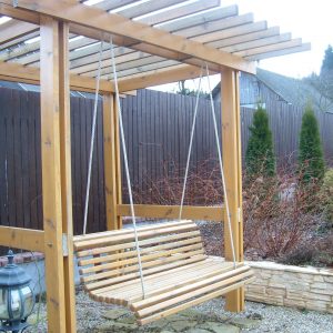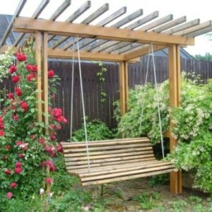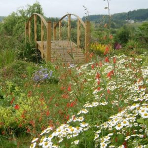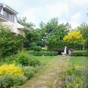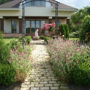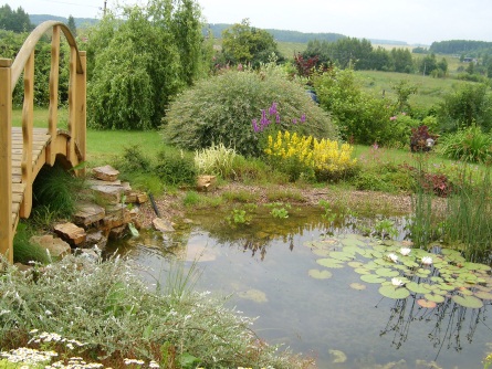 Вот мы обошли вокруг дома и спускаемся к водоему и плодовому саду. Небольшаяпергола, которую, как мы надеемся, все же заплетут розы и клематисы, соединяет и продолжает миксбордер, пересечённый дорожкой, где как раз нашли себе место английские розы.