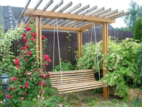 За спинкой большой скамейки высажена изгородь из туи, за которой полукругами, повторяющими контуры площадки, находятся газон и большой миксбордер.