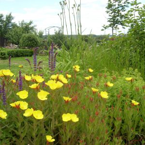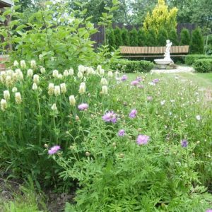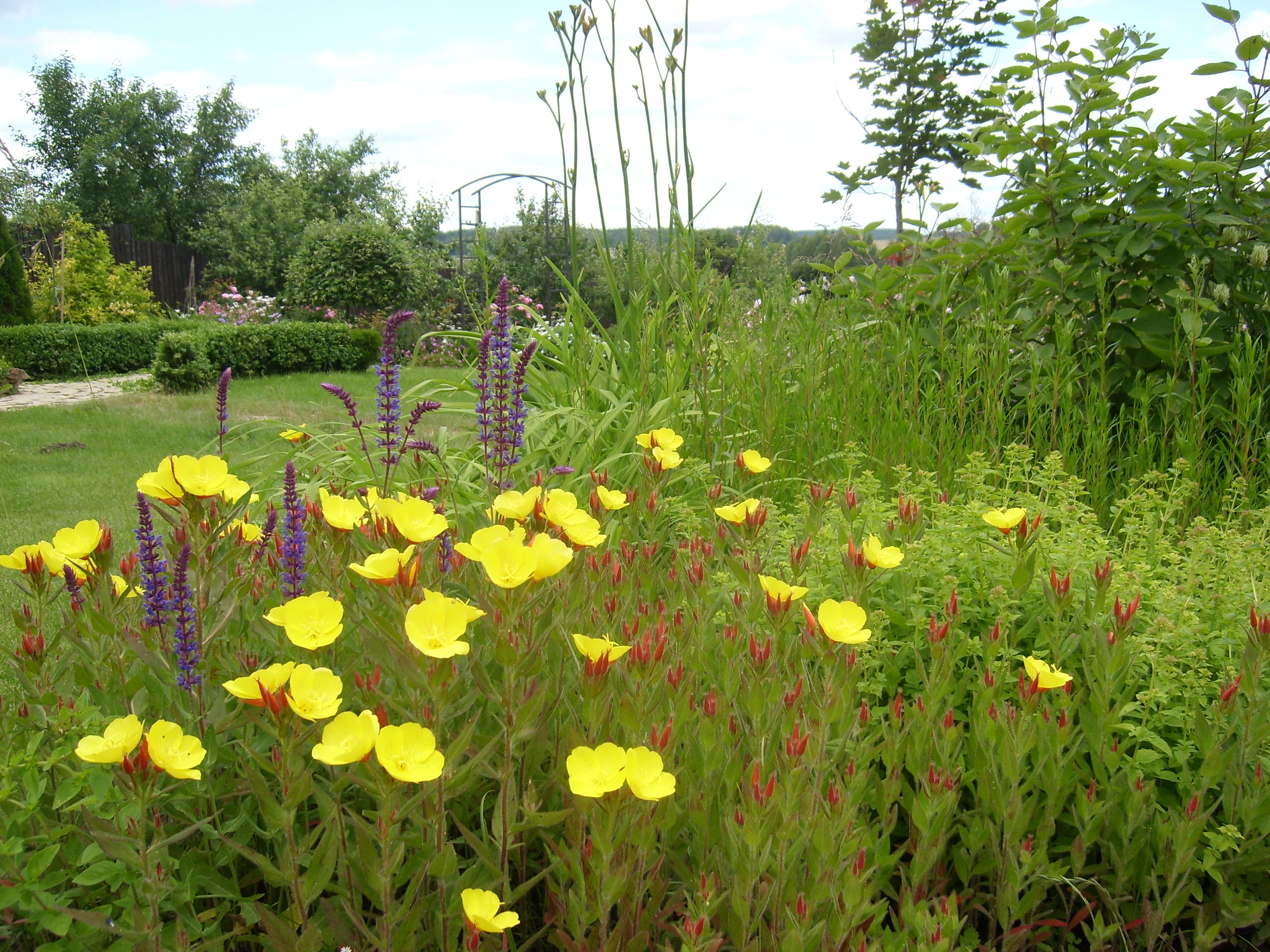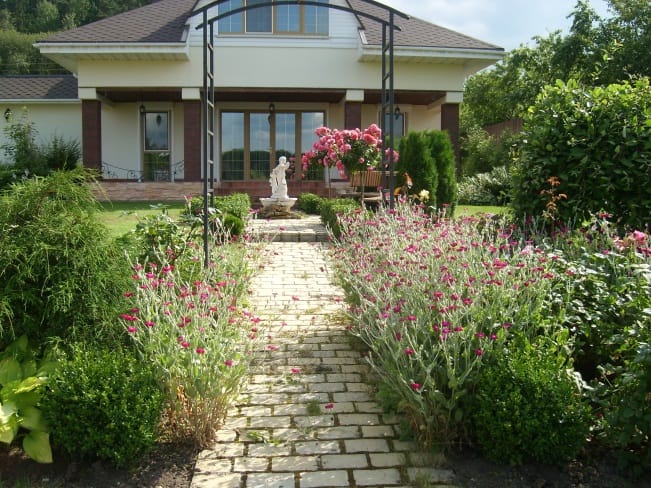 С качелей открывается вид на площадку перед домом, к которой можно пройти по полузаросшей комбинированной дорожке вдоль небольшого цветника, условно называемого «полевым». Так получилось, что этот треугольник между дорожками оказался с очень проблемной почвой – бедной, уплотненной. Мы решили не заменять грунт, а подобрать на это место соответствующие растения. Структуру цветнику создали калина гордовина и спирея японская, а дополнением послужили клевер, василек, душица, мелколепестник, котовник, живучка, лилейники, энотера, шалфеи и герани.
