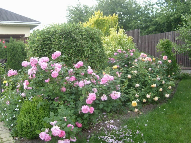 Имея большой ассортимент в наличии, перед глазами, можно было экспериментировать с группами, до изнеможения перетаскивая их с места на место, корректируя сочетания. Нужно сказать, что со временем, конечно, потребовались некоторые изменения, но они не были глобальными. Гораздо больше внимания и работы потребовали многолетники и розы. Так, впервые тогда появившиеся на рынке английские розы на местных плодородных грунтах вымахали гораздо больше ожидаемых размеров и потребовали пересадки и формирования отдельного цветника-миксбордера.