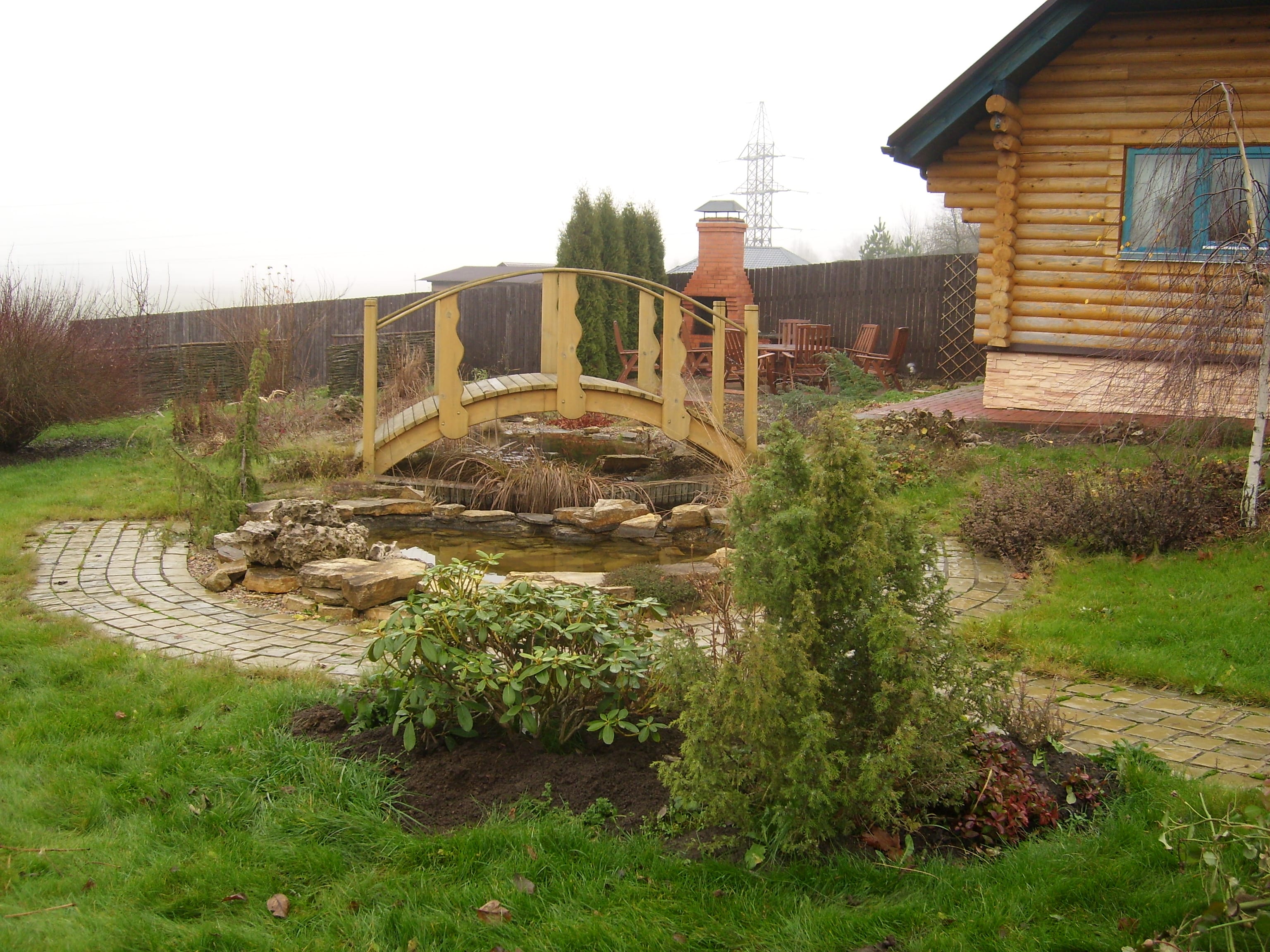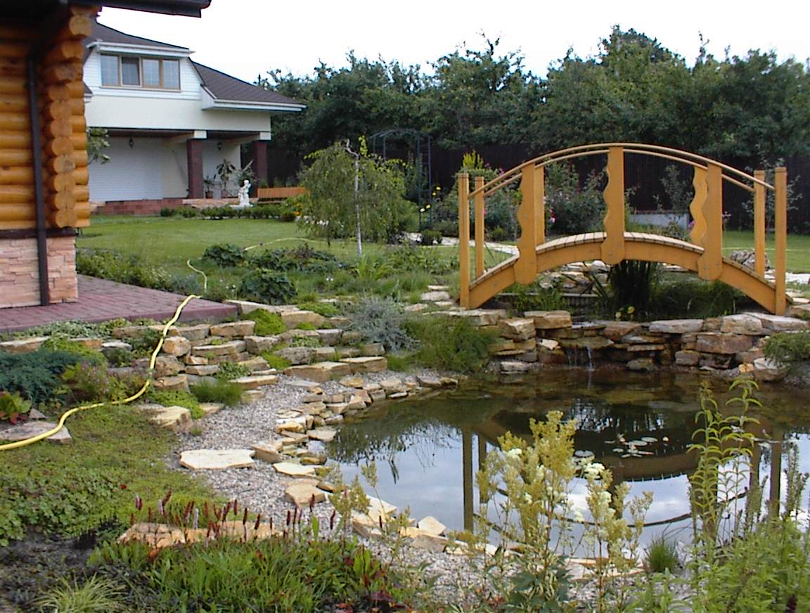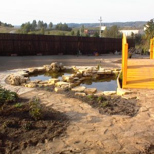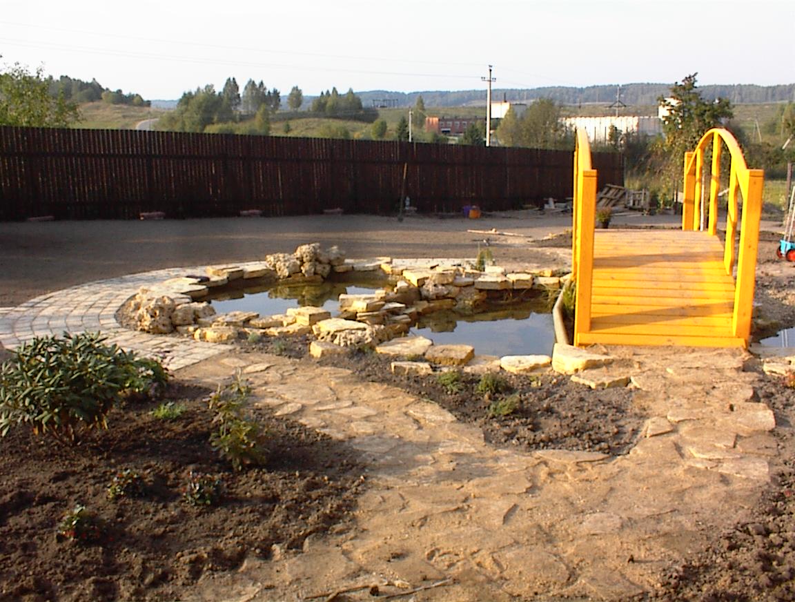 У водоема мощение плиткой переходит в мощение камнем. Водоем получился каскадный трех-уровневый, с мостиком.