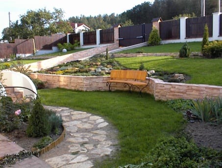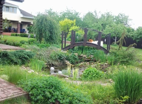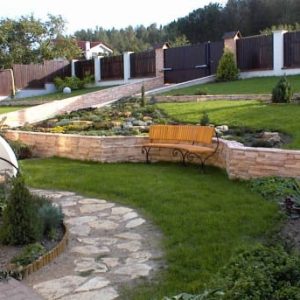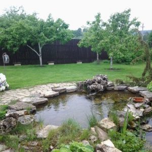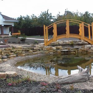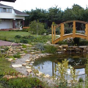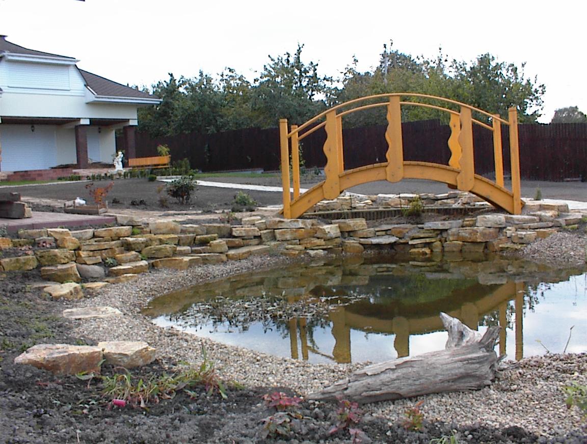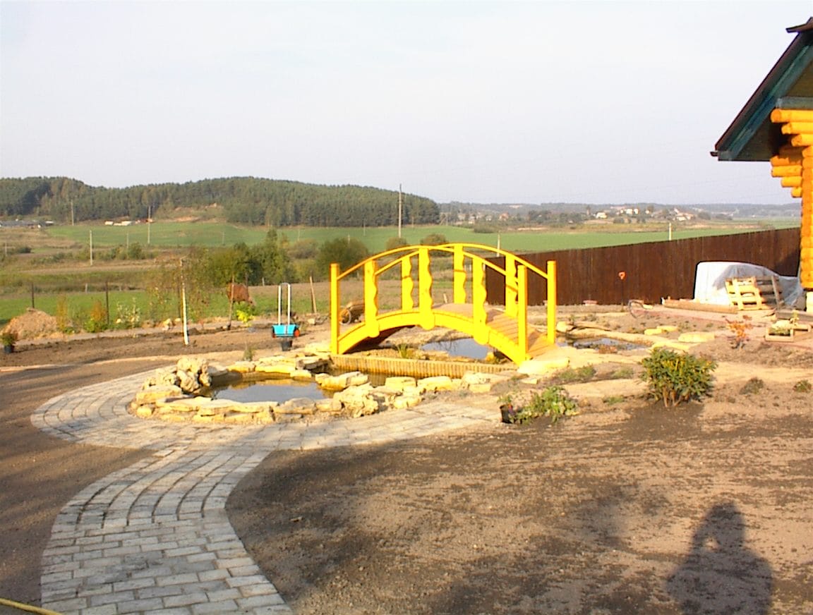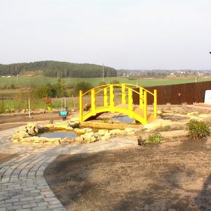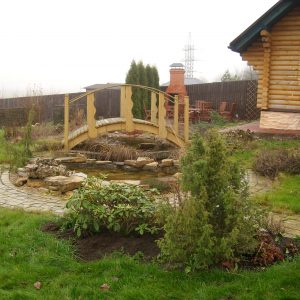 У водоема мощение плиткой переходит в мощение камнем. Водоем получился каскадный трех-уровневый, с мостиком.