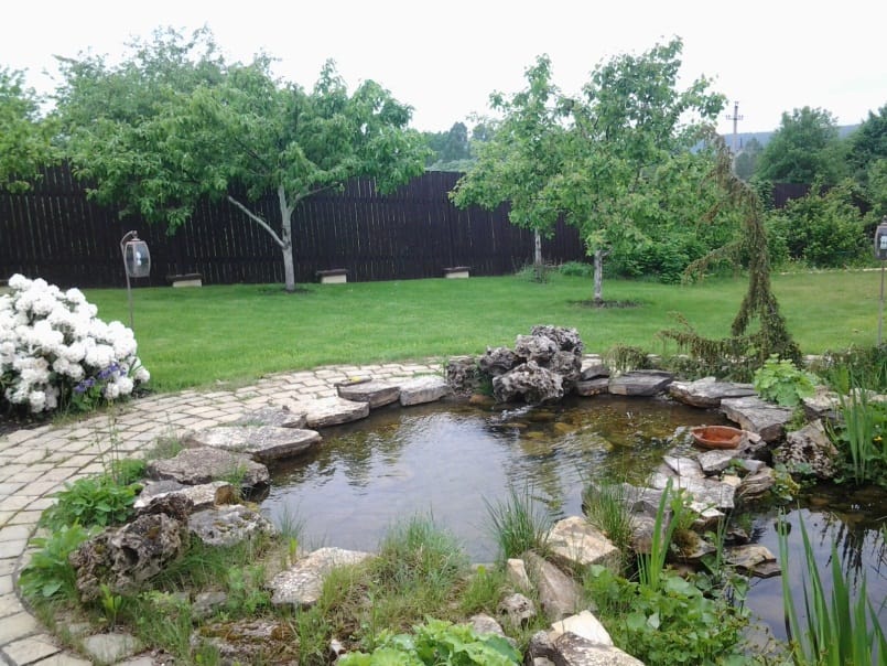 Раз есть перепад высот и движение воды – возникла мысль построить встроенный природный фильтр и отказаться от покупных дорогих импортных. Идею удалось реализовать, разместив песчаный фильтр и биоплато под мостиком, хотя потом все равно пришлось помучиться, избавляясь от нитчатых водорослей и добиваясь сбалансированной экосистемы. В двух словах, главное, от чего зависит прозрачная «живая» вода – наличие достаточного количества водных растений и кислотно-щелочной баланс. Известняк и гравий в оформлении – это красиво, но почти неизбежно приводит к росту водорослей.
