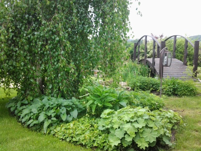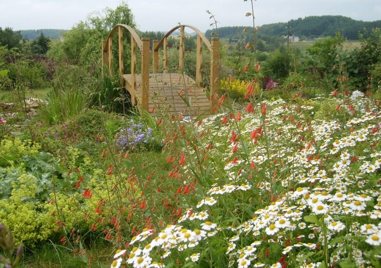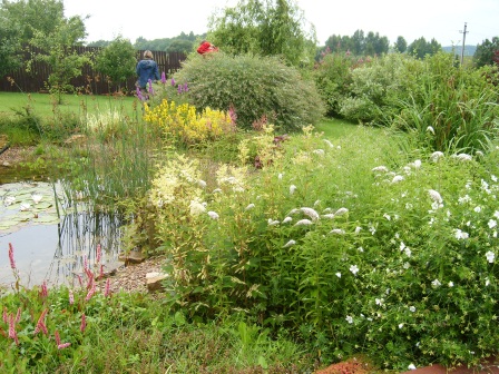 Дорожка к мостику вдоль бревенчатой бани проходит сквозь еще одно «русское поле». Настроение создает береза Юнги,кандык,буквица, вальдштейния, манжетка, пиретрум, пенстемон, колокольчики. Пускай не все растения растут буквально на наших лугах, но общее ощущение они создают отлично.