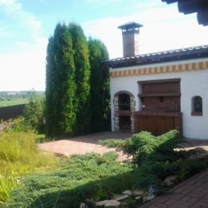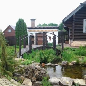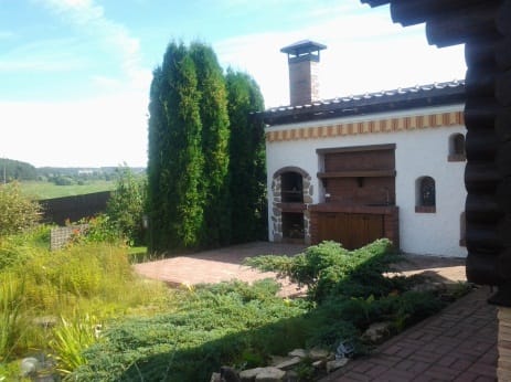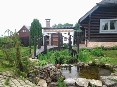 Вокруг водоема можно пройти на площадку с печкой-барбекю, спрятавшуюся за баней.