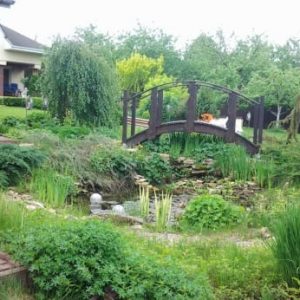Верхний уровень с источником, выливающимся из камня, переливной и без растений. Второй уровень – с мостиком и зарослями ириса болотного.