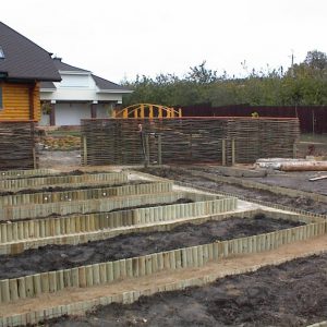 Дальше было еще интереснее – работать предстояло без проекта. Правда, было условное зонирование, сделанное архитектором дома. Отталкиваясь от него, мы начали работать над мощением и водоемом. Отмостки вокруг дома и бани задали новый уровень грунта по всему участку – еще одна непредусмотренная задача, которую пришлось решать.