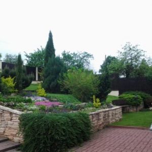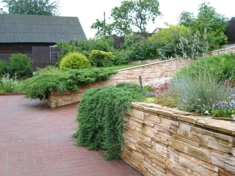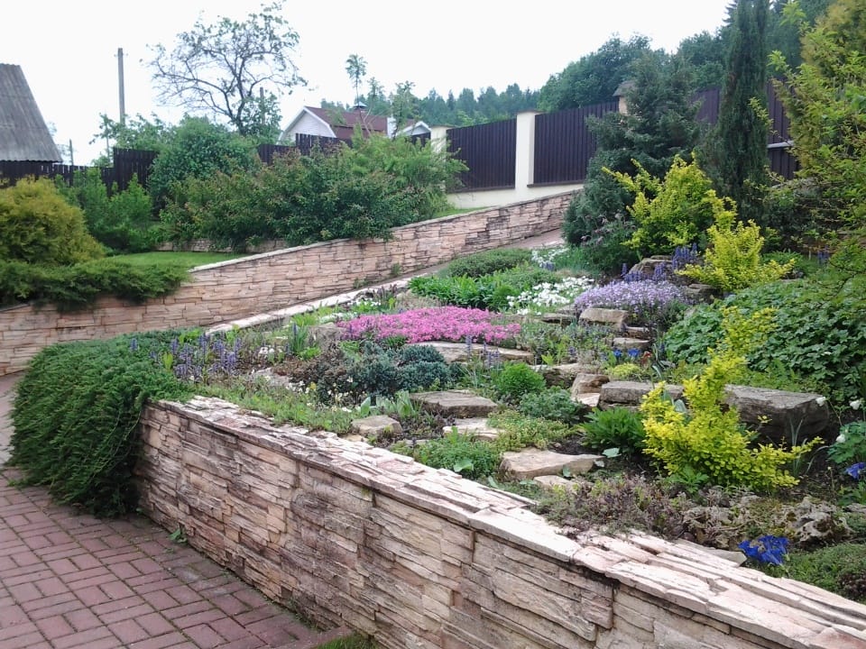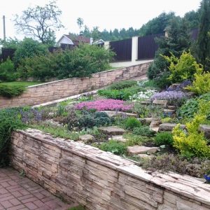 Террасы на входе были оформлены небольшим альпинарием и композициями из кустарников. Подпорные стенки подчеркнуты посадками айвы японской и почвопокровных роз.