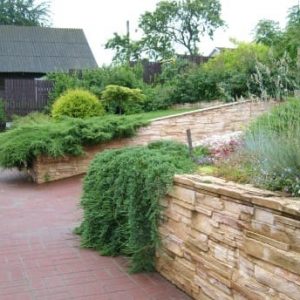 Этот массив скрывает у бани укромнуюплощадку с качелями. Нас просили создать запущенный, «дикий», скрытый от глаз уголок. Площадка с дорожки практически не видна из-за перепада высот (у бани есть еще одна небольшая подпорная стенка) и бурно разросшихся растений – стефанандры, плетистых роз, маньчжурского клематиса, душистого жасмина, шаровидных туй,можжевельников и рододендрона.