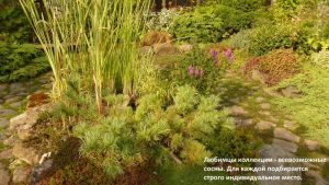 Преобладающие в коллекции деревья и кустарники, хвойные и лиственные, ещё не достигли вершины своего расцвета. Ведь сажаются растения небольших размеров, чтобы лучше адаптировались и приспособились к своему новому месту жительства. Принципам композиционного построения и колористического решения
