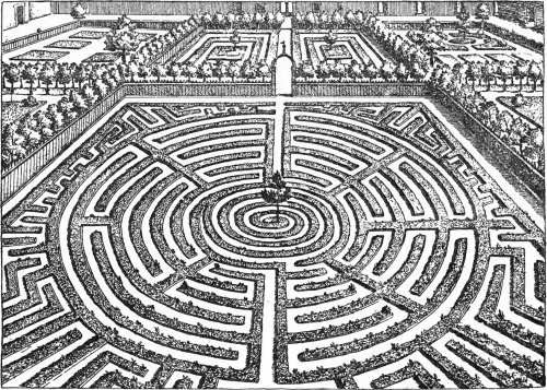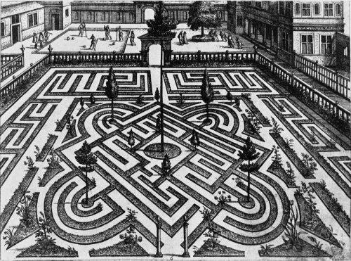 Лабиринт стал центральной темой и на садовых гравюрах у Х.Вредерман де Вриса: округлые или квадратные в плане, в виде самостоятельного сада, или как элемент партера, лабиринты с высокими элементами (трельяжами, аркадами и павильонами) и лабиринты, устроенные в плоскости газона. На гравюре, изображающей сад самого художника (рис. ) центр лабиринта занимает круглый павильон ротонды с майским деревом.