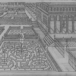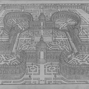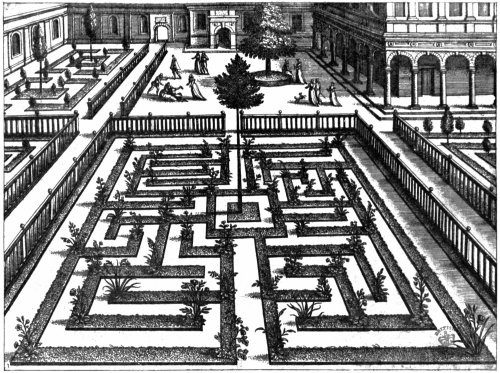 Лабиринт стал центральной темой и на садовых гравюрах у Х.Вредерман де Вриса: округлые или квадратные в плане, в виде самостоятельного сада, или как элемент партера, лабиринты с высокими элементами (трельяжами, аркадами и павильонами) и лабиринты, устроенные в плоскости газона. На гравюре, изображающей сад самого художника (рис. ) центр лабиринта занимает круглый павильон ротонды с майским деревом.